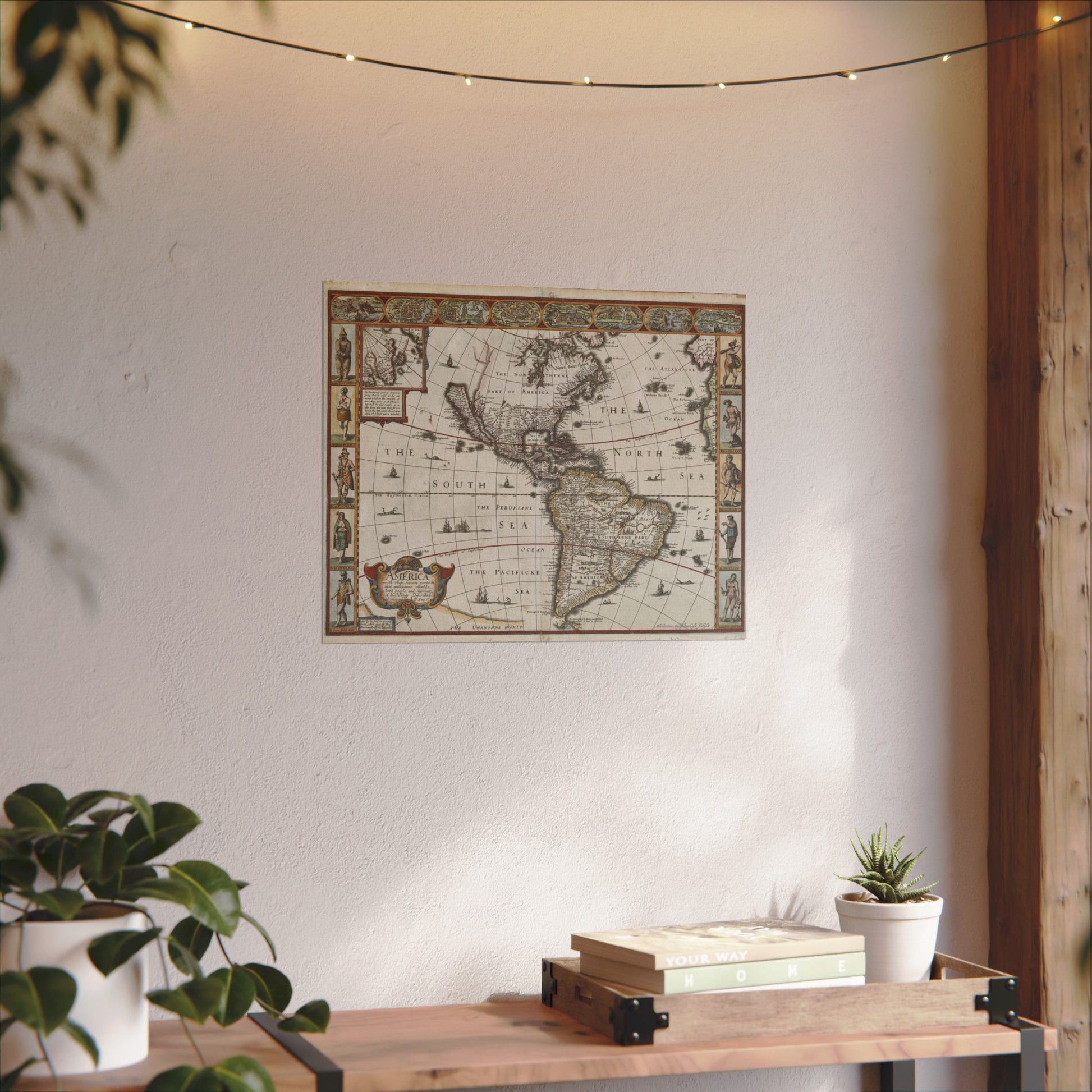 A textured watercolor matte poster that brings antique charm to modern walls. Printed on heavy 285gsm watercolor paper with archival inks, the map’s muted earth tones and delicate border illustrations reveal subtle brushlike textures and a matte, wallpaper-like finish. It hangs beautifully in study nooks, home libraries, or above a writing desk — the kind of piece that invites you to trace coasts with your finger and imagine old voyages.